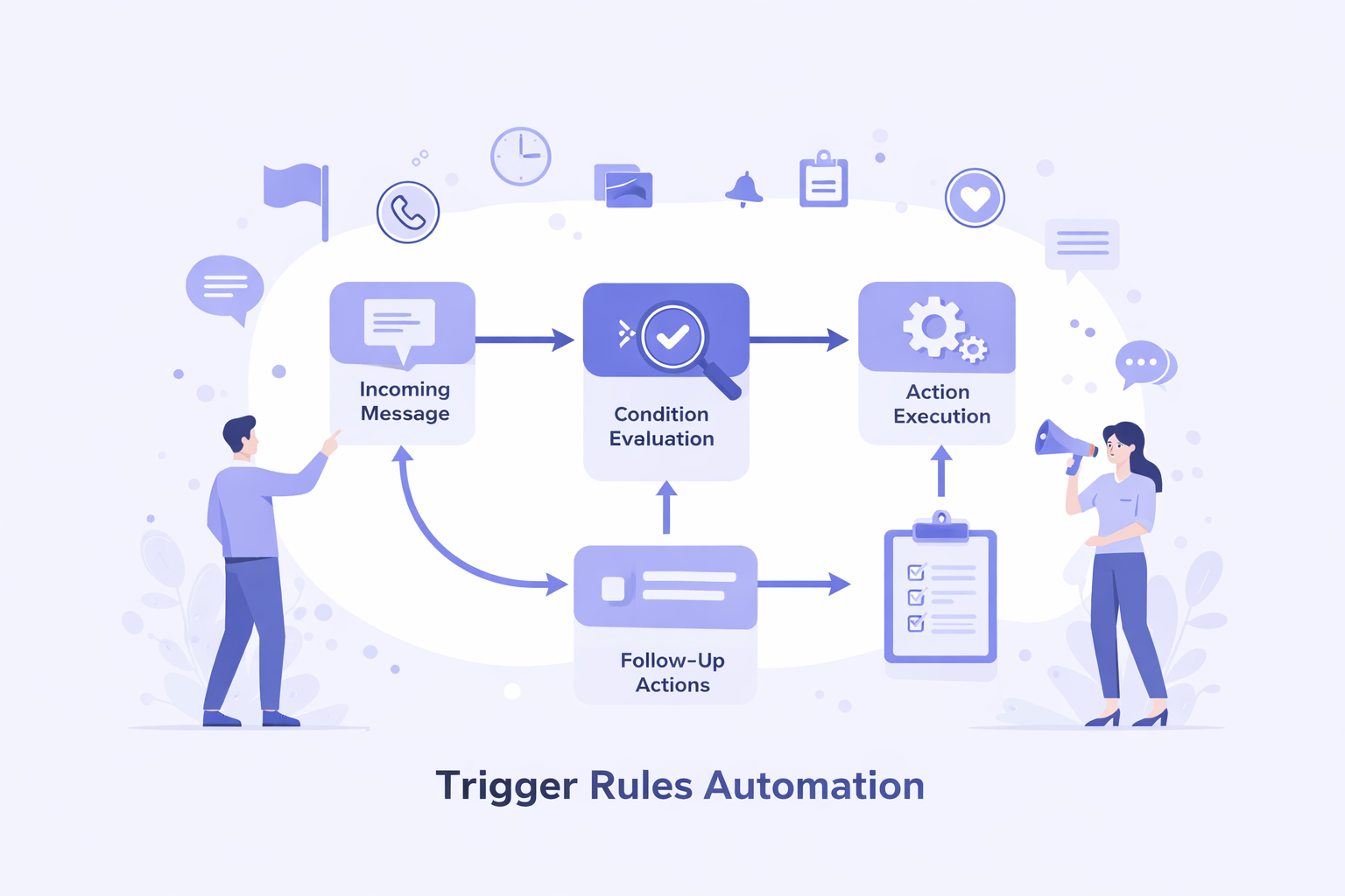 Incoming Message → Condition Evaluation → Action Execution → Follow-Up Actions.