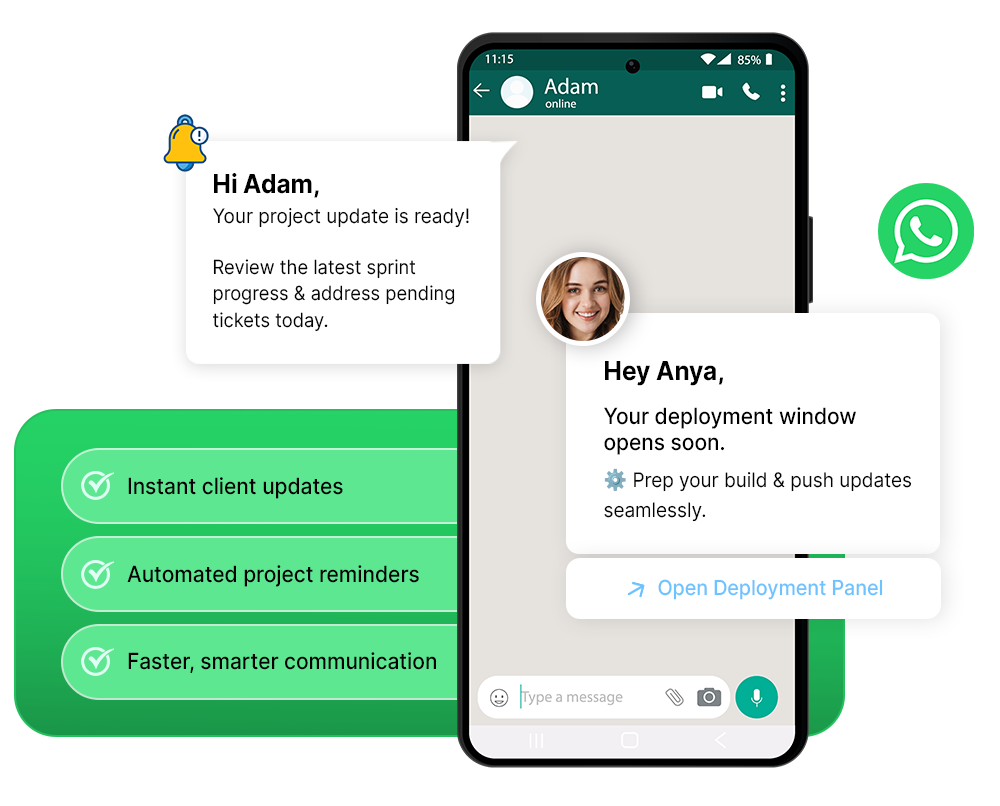 Save time and boost productivity by sending timely updates, reminders, and engaging clients instantly with WhatsApp automation for IT projects.